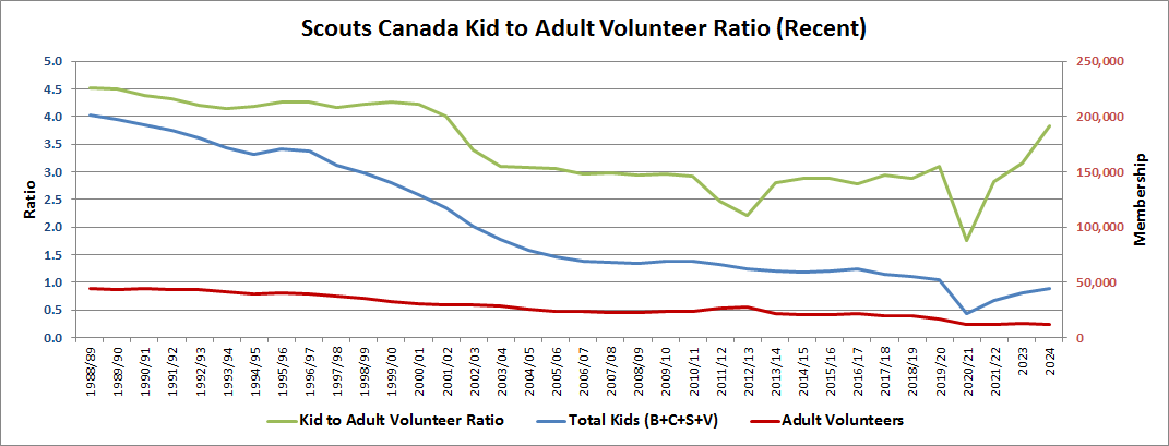 The following is based on data from the national archives and Scouts Canada annual reports. Note that the year is the Scouting year. So 2004 means the September 2004 - August 2005 Scouting year. This figure would appear in the 2005 annual report. For clarity in some of the graphs, figures for Rovers, ScoutsAbout, Extreme Scouting are not shown, as ScoutsAbout is just a day care service and the others only amount to 0.01% of the total kids in the program. Thus the total kids only includes Beavers, Cubs, Scouts, and Venturers.