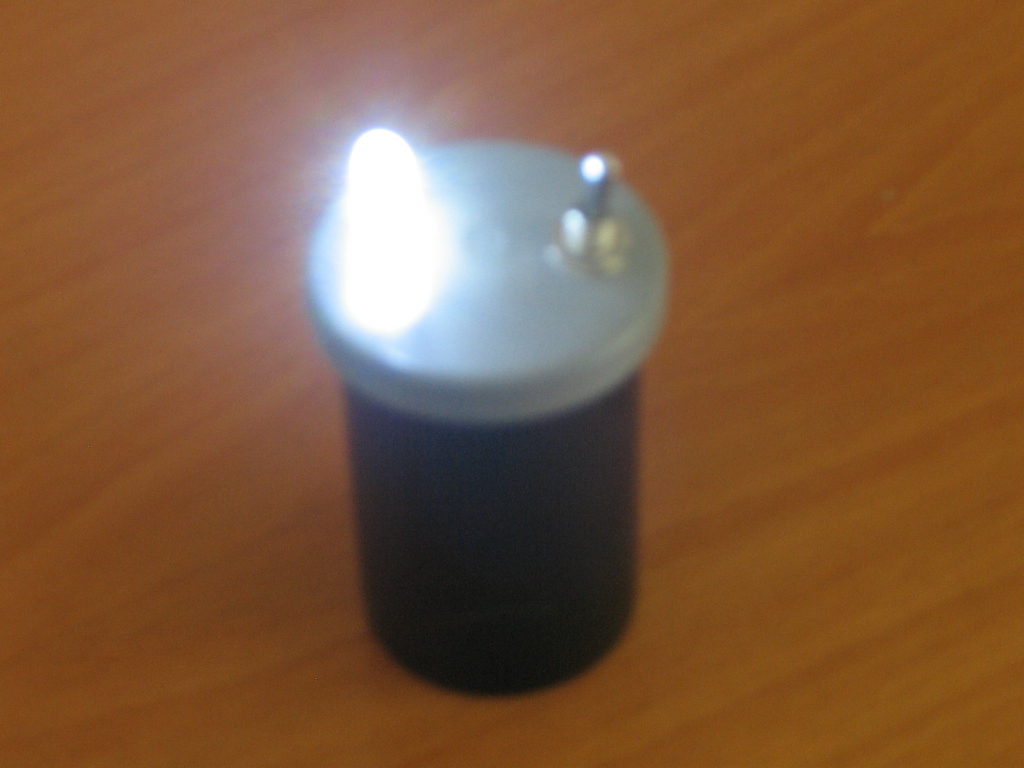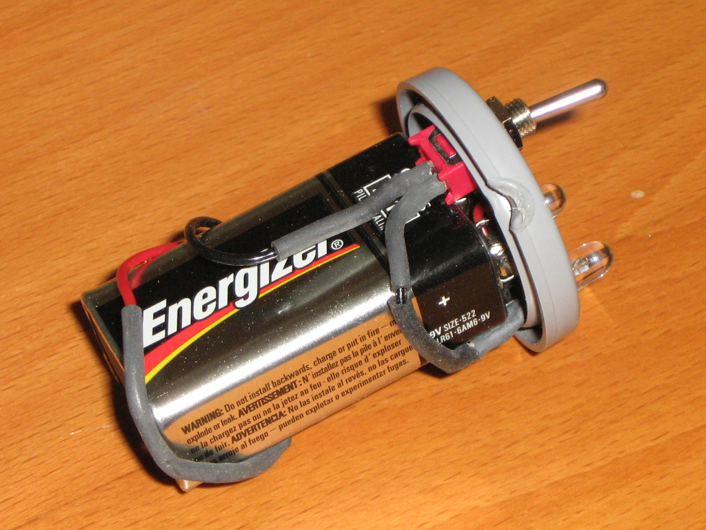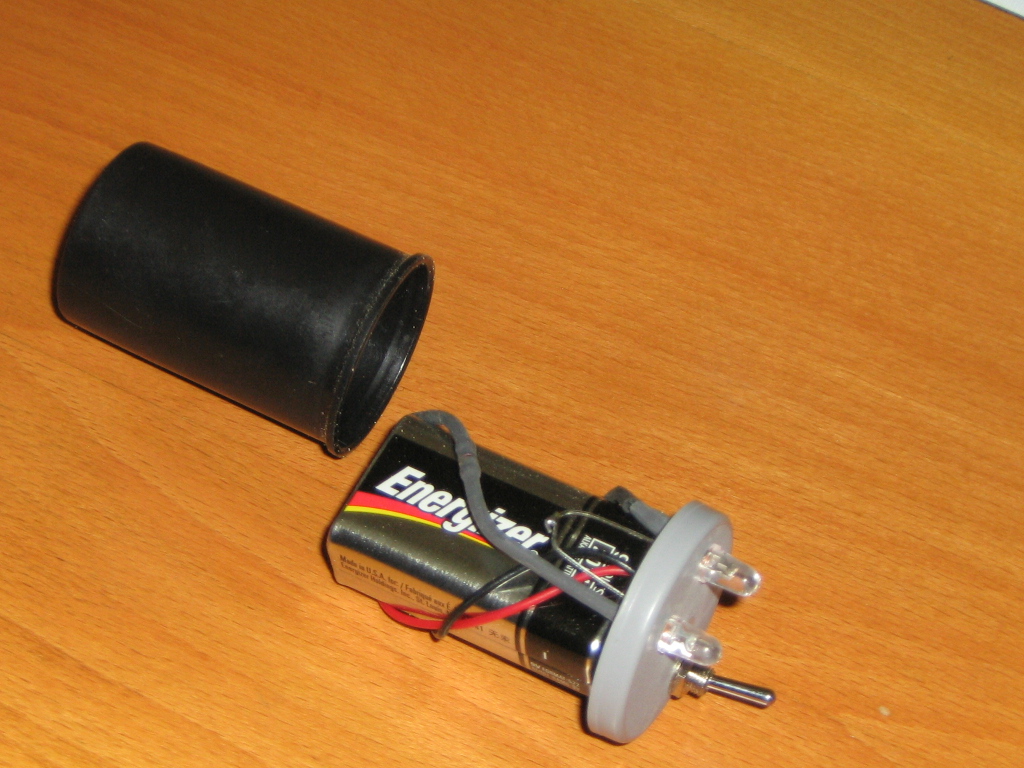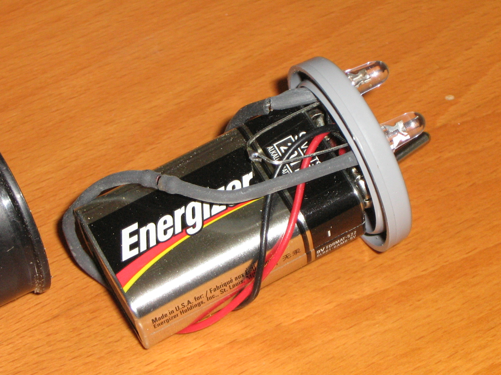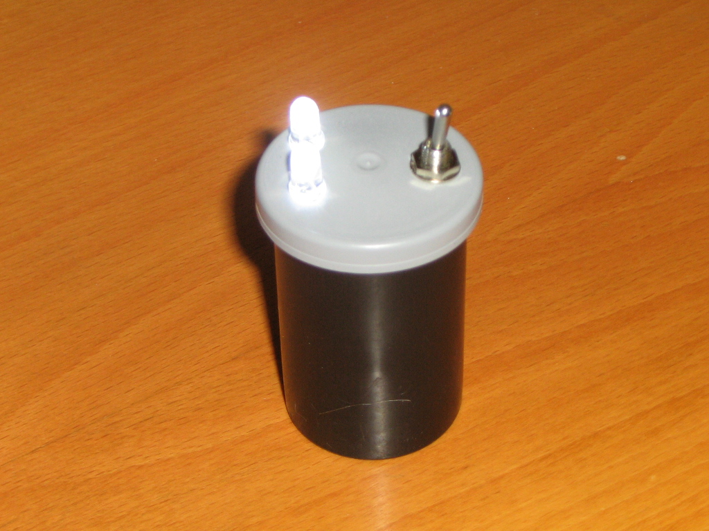 The original design of this flashlight (torch) came from the Exciting Scout Craft website. We modified the plan by utilising two LEDs and a smaller resistor. The power consumption is the same, but we get twice the light. i.e. Less voltage is dropped across the resistor. The resistor was sized to provide the maximum rated current and voltage to the LED based on a full 9V being supplied by the battery. Once load is applied to the battery, the supplied voltage soon drops to around 8V which brings the current and voltage at the LED down to it's typical ratings.